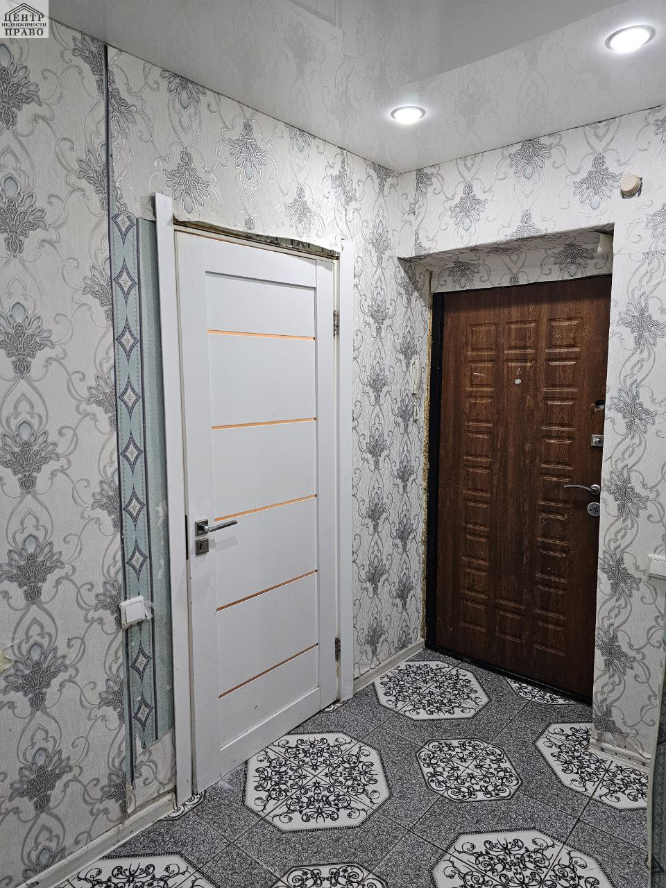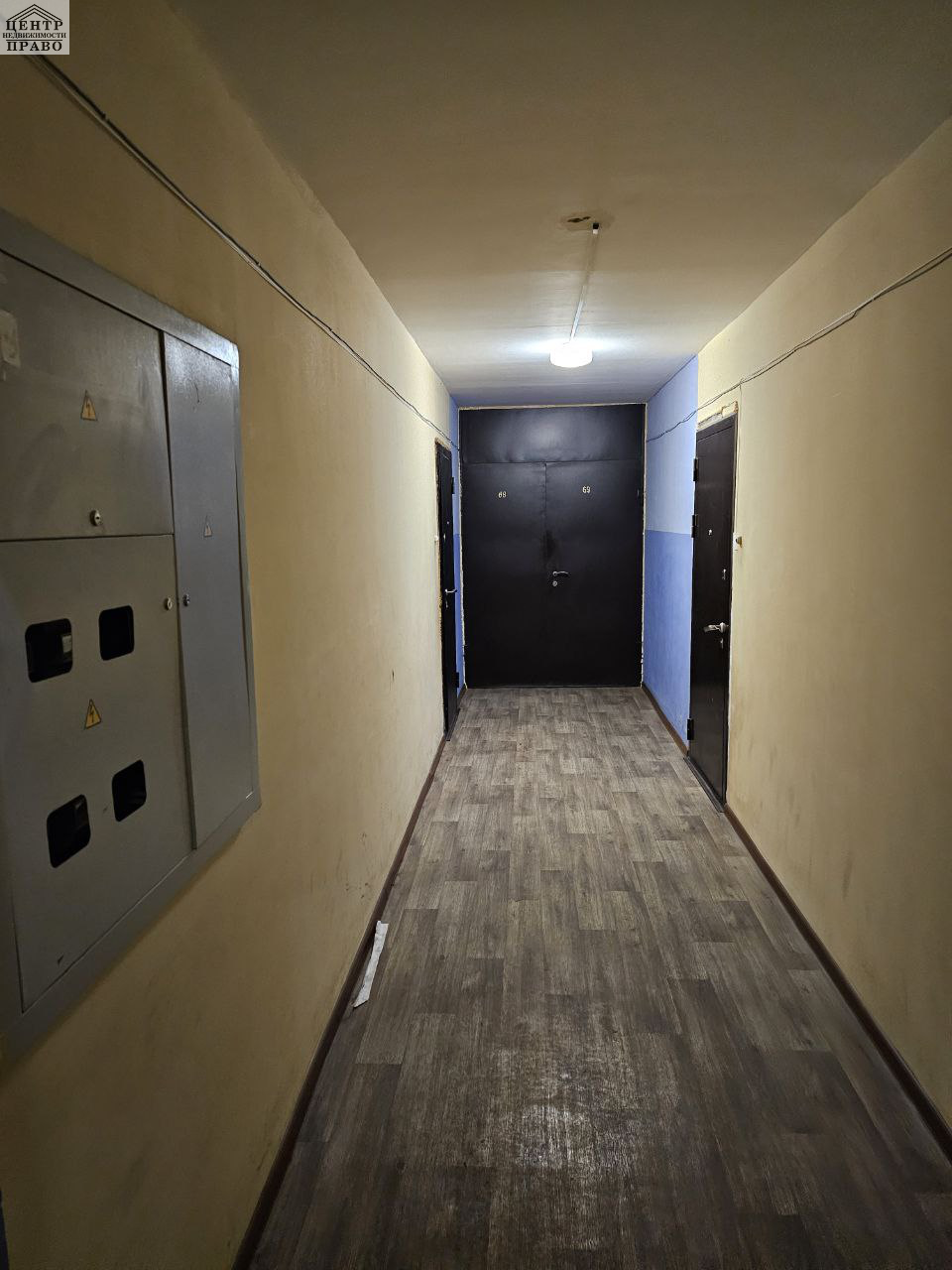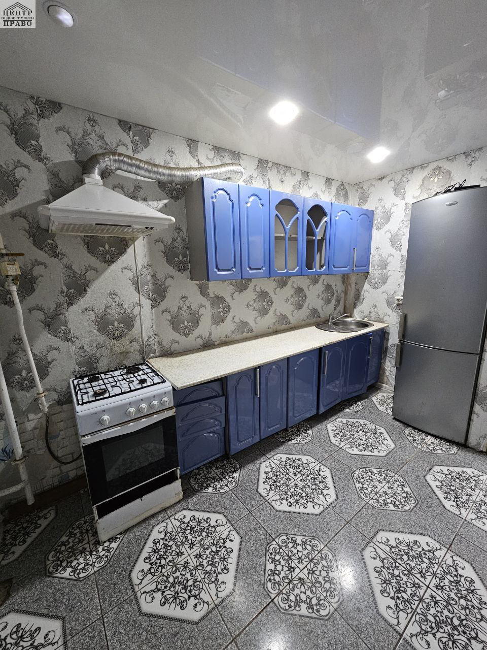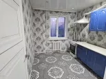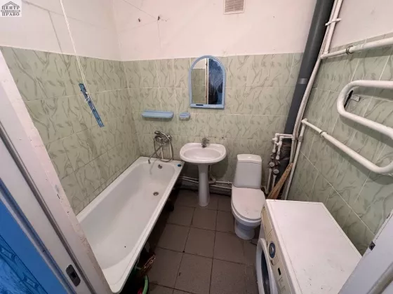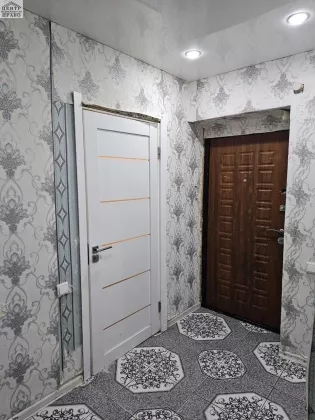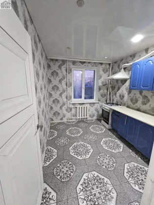В квартире требуется косметический ремонт, на кухне и в прихожей залитый пол и уложена плитка. Санузел совмещенный.